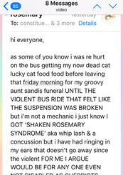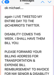 OK hi it's 11.8.2019 10:52 am....I didn't make it back to typing last night cause OWWWWWWW & AHHHHHHHHHHHH. so tracy from nw senior & disability i know i think is doing every thing she can but i do not understand how MY DISABILITY AGENCY CAN ALLOW OTHER GOVERNMENT AGENCIES TO VIOLATE MY CIVIL & DISABLED RIGHTS FOR FUCKS SAKE? OK SO WHO STOPS EVERY ONE EVERY ONE WHO HAS DONE THIS TO ME? VIOLATED MY CIVIL MY C I V I L R I G H T S IN OREGON? please feel free any one reading PLEASE LET ME KNOW. AGAIN OR I AM READY TO FILE MY $100B USD LAW SUIT AGAINST AMERICA FOR FRAUD. THE BILL OF RIGHTS IS A FRAUD AS IF YOU CAN NOT AFFORD THE VERY EXPENSIVE LAWYER BILL FOR REPRESENTATION YOU HAVE NO RIGHTS AT ALL. NONE. THEY ARE MADE UP. TOTAL BULL FUCK BEYOND BULL SHIT. BULL FUCK. I REST MY CASE WITH MY LIFE IN AMERICA. FUCK YOU ALL VERY MUCH. OK SO I WAKE UP TO XFINITY WI FI NOT WORKING PER DIALY SO I BITCHED WITH MY VOICE IN THE VIDEO AS I HAVE BEEN RECENTLY AS AT&T BILLS ME $15 FOR DATA OVERAGES WHILE I AM IN MY HOME COVERED BY MY $180+ A MONTH XFINITY BILL....AHHHHHHHH OK TRACY HAD EMAILED I DIDN'T OPEN I COULDN'T DEAL WITH IT BUT HALEY MY NICE FOOD STAMP GIRL CALLED ABOUT HOME LIFE ASSITANCE TO DO MY LAUNDRY UP & DOWN THE STAIRS NOW MY EARS ARE RINGING & MY TRIGEMINAL NERVE IS ALL FUCKED UP FROM 'SHAKEN ROSEMARY SYNDROME' ON THE VIOLENT BUS....AHHHH THE POINT OF THIS RANT....SO AS ANY ONE WHO FOLLOWS MY TWITTER I LEFT ON THE FIRST MESSAGE AFTER CHERRIOTS REPRESENTATIVE MICHAEL WHO CALLS FROM A NUMBER OTHER THAN THE ONE HE LEFT TO CALL HIM BACK ON I FIND ODD? BUT WHATEVER....HE RETURNED MY CALL TO SETTLE....ASKED ME THREE QUESTIONS THEY ALREADY KNOW THE ANSWERS TO AS I TWEETED MY DAY & BUS RIDES AS I WAS ON THEM ON MY WAY TO PETSMART THE ONLY PET STORE THAT CARRIES MY NOW DEAD LUCKY CATS PRO PLAN WET FOOD I HAD TO HURRY BACK HOME TO EVEN THOUGH I WAS HURT. HE TOO WAS NOT WELL. DAHHHHHH. I LOVE HIM. LIKE I LOVED MY AUNT SANDI. OK SO I ANSWER HIS 3 QUESTIONS AGAIN. THEN HE CALLS THIS MORNING WHILE I WAS TYPING BACK TO TRACY AT DISABILITY & LEAVES ME ANOTHER MESSAGE WITH QUESTIONS ABOUT WHERE I WAS FUCKING GOING? THIS IS NOT FUCKING ABOUT WHERE I WAS GOING IT IS ABOUT YOUR BROKEN VIOLENT BUS I EXPERIENCED THE DRIVER SHOULD HAVE KNOWN WAS UNSAFE FOR DISABLED RIDERS & YOU CHERRIOTS KNEW I AM DISABLED & EXTRA CARE MUST BE TAKEN WITH DISABLED PEOPLE AS I BELIEVE YOU GET DISABLED TRANSPORTATION CASH? YES? I ARGUE NO ONE IS SAFE ON YOUR BUSES DISABLED OR OTHERWISE NOR AT YOUR BUS STOPS ESPECIALLY DISABLED PEOPLE USING MOBILITY DEVICES NOR ARE THE MOBILITY DEVICES SAFE WITHOUT MANDATORY PARKING BRAKES TO STEADY ALL MOBILITY DEVICES PROPERLY & SECURELY. LOOK YOU'D NEVER KNOW ANY OF THIS BULL SHIT UNLESS YOUR LIFE PLOPPED YOU IN THE MIDDLE OF THESE DISABILITY & MOBILITY ISSUES THAT ARE EMBARASSING HUMILIATING & VERY COSTLY TO GET PROPER CARE & THIS DISABILITY IS FROM NO FAULT OF MY OWN I WAS DROPPED IN A MALFUNCTIONING ELEVATOR ON MY WAY TO WORK AT AUTO ROAD SERVICES ON VENTURA BOULEVARD IN 1997 WHEN THEY SHOULD HAVE REPLACED THE ELEVATORS AFTER THE EARTHQUAKE BUT DID NOT....I 'HEARD' BUT WHO THE FUCK KNOWS...I GOT FUCKED. HAD ANY ONE HAVE WARNED ME HOW EXPENSIVE ASSISTED LIVING WAS AT $5K A MONTH I NEVER WOULD HAVE SETTLED. I HAD NO REFERENCE TO ASSISTED LIVING ILLNESSES HOSPICE...ADULT DIAPERS ANY OF IT UNTIL THE PAST THREE YEARS SINCE MOM DIED AUNT SANDI HAS BEEN ILL & I'VE BEEN CLOSER TO MY AUNTY DIANA THROUGH IT ALL...HAPPILY....PROBABLY NOT FOR HER....look at my stupid life...SHE HAS TRIED TO HELP THAT JUST MADE HER HELPING WORSE IN MY LIFE FOR FUCKS SAKE....GO BACK TO ROSEMARYWALKER.COM & READ WHAT I HAVE STARTED OF THE JUDGE MURPHY DIVORCE NIGHTMARE OR WHERE EVER I WROTE THE CASHIER CHECK THING. ME DISABLED. GOT FUCKED OUT OF DISABILITY & AUNT HELP CASH. BUT I ME ROSEMARY SHOULD NOT EVEN BE ALLOWED TO TYPE FOUL WORDS? fuck you. i for real am having to pretend to be a lawyer...an excellent pretend lawyer by the way....i have learned from the very best...judge judy, the peoples court, harvey levin, jeffrey toobin, teller, kateal cuomo ....uhhhhhh law & order......oh judge murphy forcing me to look up disability stuff he ignored during my divorce i had to lawyer myself for even though he denied my civil right to due process so my legal work was all for naught or in legal terms MOOT. cherriots E*MAIL SETTLEMENT DOCUMENTS WITH YOUR NUMBER YOU KNOW MINE & FOR WHAT TO BIGROSEMARY@GMAIL.COM THE WAY I PREFER TO COMMUNICATE AS MY VOICE WILL SCARE THE FUCK OUT OF POOR MICHAEL AT SOME POINT....TRUST ME. I SIGN WITH MY EDIT PEN. YOU WIRE CASH TO MY BANK ACCOUNT & YOU PAY ALL TAX WRITE IT UP AS YOU MUST LIKE JUDGE MURPHY MCGEEHEE & MY EX EX DID TO ME. FUCK YOU VERY MUCH. OR WHEN THE RIGHT LAWYER GETS BACK WITH ME PAY THEM 33.3% ON TOP OF WHAT I AM REQUESTING THERE WILL BE NO NEGOTIATING MY 40 YEAR GUESSTIMATE OF LIFE I HAVE LEFT IN SUFFERING PAIN & INSULTS CHERRIOTS. THOSE ARE MY TRANSPORTATION EXPENSES TO DATE BELOW ALTHOUGH I DO NOT WISH TO USE LYFT WELL I WILL TRY LX SERVICE NEXT TIME. LET'S SETTLE THIS TODAY. MAKE THIS OVER FOR ME PLEASE.