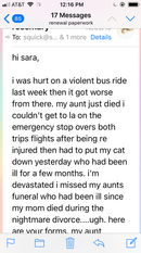 today is 11.7.2019 I missed my groovy aunt sandis funeral & lucky is gone ….I was injured on a violent what felt like broken suspension but i'm not a fucking mechanic cherriots bus on my way to get lucky food before leaving on emergency flights with stop overs both ways to aunt sandis' funeral again....I was un able to attend with my family because I am hurt......my life you can't make it up....oh wait then it has gotten far worse.....