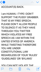 it is 11.19.19 i'm so upset I am shaking. as you all know who read & follow me someone is reporting me for being AN EXTREMELY EFFICIENT TWEETER. MY NEW FAVORITE FREE TYPED TWITTER SPEECH IS 'THE DEMOCRATIC VOTE MESSAGE SHOULD BE 'COME ON REPUBLICANS THERE MUST BE A NON PUSSY GRABBING OPTION' FUCK I JUST NOTICED THERE HAS BEEN A MISTAKE IN EVERY SINGLE TWEET GOD DAMN IT....SEE I DON'T FEEL WELL MY EARS HAVE RRRRRRRRRRRRRRR SINCE THE VIOLENT CHERIOTTS BUS RIDE & I TOO AM HUMAN AN ADDED AN A ON TWITTER. SO THEN TODAY I DECIDE TO FIGURE OUT HOW TO GET BACK INTO MY @FICOSHUTDOWN181 AS ALL OF MY DIVORCE COURT EVIDENCE IS SAVED AS LIKES THAT NOW HAVE VANISHED AS I AM AGAIN LOCKED OUR AFTER JUST GETTING BACK IN. DAHHHHH. YOU CAN NOT HAVE 'GUIDELINES' 'RULES' 'BYLAWS' 'BULL SHIT' IN AMERICA THAT VIOLATES THE CONSTITUTION OR MY RIGHT TO ACCESSIBILITY THE AMERICANS WITH DISABILITIES ACT STATES I HAVE. IF I AM USING TWITTER WITHIN THE UNITED STATES OF AMERICA NO ONE CAN SILENCE MY FREE TYPED SPEECH. PERIOD. NOT EVEN THE PUSSY GRABBING TATTLE TALE OR HIS PEOPLE IF THAT IS WHO IS REPORTING ME & I CAN'T IMAGINE WHO ELSE IT WOULD BE CAN YOU? TYPING MY 'BEHAVIOR' OR 'TYPING' IS UNUSUAL IS ALSO DEFAMATION OF MY CHARACTER TWITTER. OMG I ALMOST FORGOT SEE I AM SO UPSET RIGHT NOW.....THE OTHER DAY I WAS THINKING 'MORNING CONSTITUTIONAL'...MY NEW FAVORITE BULL *SHIT CONSTITUTIONAL BILL OF RIGHTS JOKE. 🍪giggle *although NO THING IN MY LIFE IS FUNNY AT THE MOMENT. THIS IS MY REALSALEM OREGON AMERICA LIFE PEOPLE. I AM SCARED FUCKING SHIT LESS. 503.409.7107 I NEED A REAL LAWYER. PLEASE.